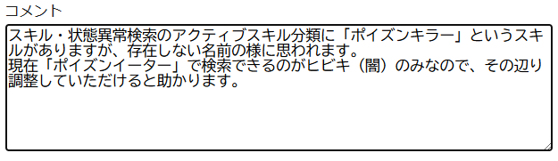 >>772 スキル・状態異常検索のご指摘ありがとうございます。 確認の上、適宜対応したいと思いますので少々お時間をください。