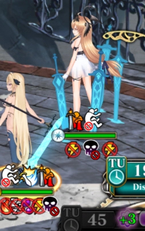| 敵1体に300%ダメージ。この攻撃は対象のダメージ減少効果を無視し、またアイアンハートなどのHPが1を下回るダメージを耐えるスキルの効果を無視する(ボスの持つスキルは除く)。さらに、対象のスキン系のパッシブスキルの効果、及びカウンター状態の効果を無視する。 その後、ブルーコネクトを持つ味方全員のTUを0にして即座にターンを与える。その際の行動順は、このスキルの使用者が最初になる。この効果で与えられたターンにおいて、その味方は「ギフトターン」系のスキルは使用できない。このスキル(ブルーサテライト)自身はTUを0にする効果で与えられたターンにも使用できるが、その場合には味方のTUを0にする効果は発動しない。 |